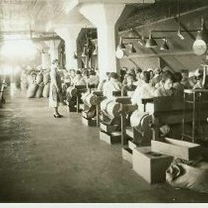 View of the sorting tables showing a portion of the crew at work removing undesirable kernels from the moving belts.