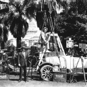 McCurry Co. vehicles, photographers, and photographic equipment pose for promotional photo with Capitol building behind them. Harold J. McCurry at base of ladder?