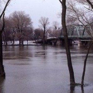 American River at flood stage passing under Jibboom Street Bridge and flooded Discovery Park.