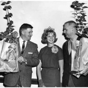 Sacramento's reigning 1964 Camellia Queen, Pamela Wyckoff visited Woodland to present camellia plants to Yolo County officials. On the left is William E. Duncan, chairman of the Board of Supervisors and on the right mayor of Woodland, B. E. Giovannetti.