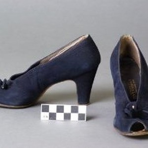 Women's dark blue suede pumps with peep toe, raised bow on vamp, and two-inch continental heel. Labels: "I. Miller, Beautiful shoes made in New York." "Made expressly for I. Magnin & Company, California."