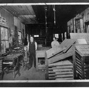William C. Brill, son Leon and Beth Batey pose in the newspaper office of the Elk Grove Citizen and Printing Office in 1915.