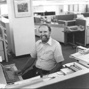 Man seated at computer in the Bee offices. Tracy was a reporter and garden writer for 30 years for the Sacramento Bee, 1968 to 1999, when he retired. His gardening column was "The Garden Detective."