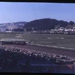 The start of what is identified as the "4th Race" showing the horses on the track at the starting gate and some of the stand at Golden Gate Fields racetrack. The slide is dated April 26, 1958.