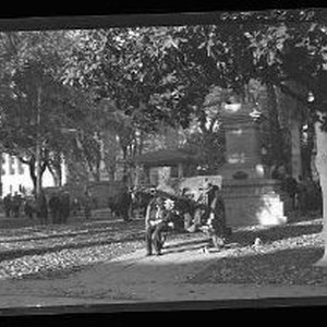 A view of the A. J. Stevens memorial statue in Plaza Park. A canon is parked in front of the statue and a man is sitting on the canon.
