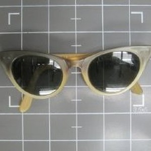 Pair of women's eyeglasses, Width 5-1/2 inches x 5-1/8 inches temple piece, green tinted perscription lenses, ivor shading to gray plastic frames, " 'Babana' T8-2045"