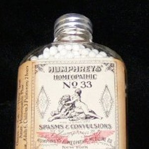 Pharmaceutical carton with sealed intact contents reads HUMPHRIES HOMEOPATHIC NO. 33 FOR SPASMS AND CONVULSIONS A collection of this manufacturer of propriatory medicianl homeopathic preparations for various diseases and conditions. NOTE: The contents of this carton is a clear glass bottle with metal cap and paper label with text: "Humphrys Homeopathic No 33 - Spasms & Convulsions...Humphreys Homeopathic Medicine Co." and is onopened with contents intact. THIS BOTTLE HAS BEEN PLACED ON EXHIBIT WHILE ITS ORIGINAL CARTON REMAINS "Processed"