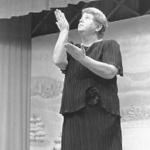 Woman signs for the deaf on stage. Risers and mural behind her are set up for a performance. She is a pioneer in her profession.