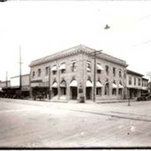 Photo--black and white: The Kingsbury Building in 1920 looking northeast. The stone block building was located on the corner of Main Street and Santa Rosa Avenue (Highway 12). Vintage cars can be seen around the building and well as other shops--Borba's store and Worth's Ice Cream. Bank of Sonoma, Worth's Drug Store. The streets are dirt and the P&SR railroad tracks can be seen in foreground.