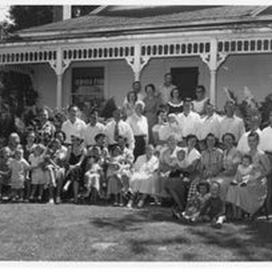 Photo, black and white: Barlow family reunion and Grandma Laura Barlow's House about 1950s. ADD NAMES