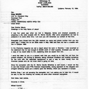 Five letters exchanged between Mihael Kuzmič, Larry Horvat, Greg Mauro and Stephen Burras about the crusade in Slovenia in 1992, and some issues that came after it. [Description English/roman)] Pet pisama izmijenjenih između Mihaela Kuzmiča, Larryja Horvata, Grega Maura i Stephena Burrasa o evangelizaciji u Sloveniji 1992. te o nekim problemima koji su nakon toga nastali. [Description (original non-English/roman language/script)]