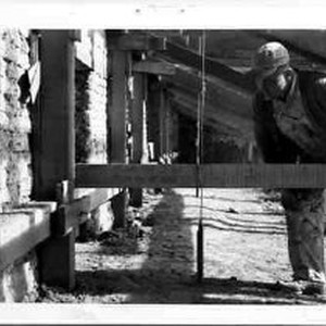 Photographs from Petaluma Adobe Report. Close up of restoration work bracing. Caption on back: Petaluma Adobe. Post #9. After plumbing. 3'1". Photo by: F. Oltman. 4/7/53