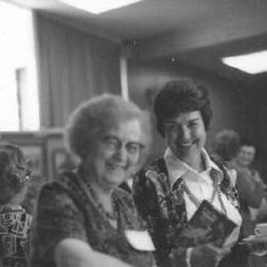 Two women face the camera, with several other women standing in the background. One woman holds a book. Paintings hang on the wall in the background. On the back of the photograph is written, "Lorena Olmsted, Charlotte Hutchison." This may be the 50th Anniversary celebration of the Sacramento Branch of the NLAPW. Photograph removed from Scrapbook, 1967-1978, 2003/051/006.