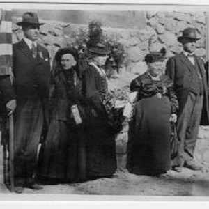 View of the members of the Donner Party at the dedication of the Pioneer Monument near Donner Lake, California. Dedicated June 6, 1918. Became California State Landmark, #134. Nevada County. Left to right: Governor Emmet D. Boyle of Nevada, Patty Reed--Martha Jane Reed, Lewis; Eliza P. Donner Houghton; Frances E. Donner Wilder; and Governor William D. Stephens of California