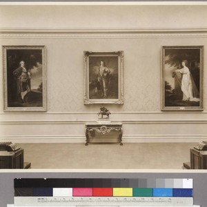The portraits on the wall from left to right: George Romney's Jeremiah Milles (1780-1783); Thomas Gainsborough's Jonathan Buttall: the blue boy (1770) (the bronze sculpture beneath "Blue Boy" is Mercure (Mercury) by an unknown foundry, after Antoine Coysevox, made between 1700 and 1710); Romney's Rose (Gardiner) Milles (1780-1783). MS note on verso reads "HEH art gallery: new wing, c. 1933." Stamp on verso reads "Hiller Studio, 336 So. Hudson, TE. 6904 Pasadena."