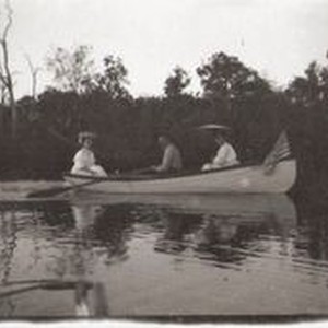 Photo--black and white: Three people (one man and two women) in small boat on Lake Jonive. Lake Jonive was north of present day Analy high school and was formed when sediment gradually created dams in the Laguna.