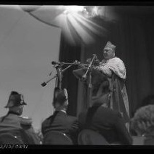 Eucharistic Congress - Fairgrounds - 4/30/50 - Bishop Armstrong giving speech with several microphones. 15 of 20