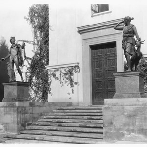 A view of the west entrance to the library building, on the south side of the structure. The steps leading to the entrance, which features large bronze doors, are flanked by two statues.