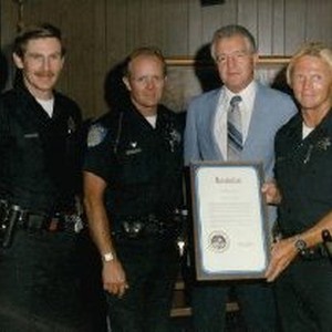 Sacramento Police Chief John Kearns and three of his officers display copy of a Resolution passed by the California Legislature. Officer Patrick Dowden on far right.