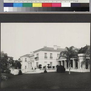 View of the southeast corner of the Huntington residence showing the loggia and south terrace. MS note on folder reads "HEH residence: south and west facades." MS note on verso reads "HEH residence. House from S.E. corner. This was taken some time ago before the vines grew on house, ***, there are shrubs & bamboo *** loggia & large boxwood trees on terrace. c. 1913."