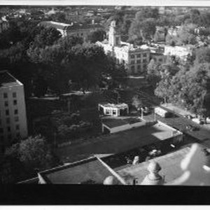 Elevated view looking down at Sacramento City Hall on I and 10th Streets. View is looking north west in 1946.