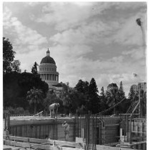 View of building construction project adjacent to State Capitol with construction workers in hard hats.