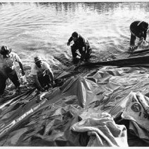 Photo caption printed in the Sacramento Bee on June 22, 1972 states: "Scores of workers fought rushing water and approaching darkness to erect an emergency dike around the southern edge of Isleton late yesterday to protect the delta town from flooding. (Subject photo) Huge sheets of plastic were drawn over the barrier in an effort to keep dirt from washing away."