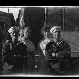 View of two men in Naval uniform identified as "Paul & Emmett" on the original container. The men are posed with unidentified women with the wall of a house behind them.