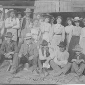 Photo--black and white: The T. J. Janes sorting and packing crew gathered for a photograph outside his dryer in Graton in 1907. The Gravenstein apple, though do not ship well are excellent for drying and for making juice and applesauce.