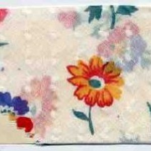 Commercial fabric samples; "124" white cotton dotted Swiss with yellow, red, green, pink, and blue floral printed pattern; mounted on cardboard