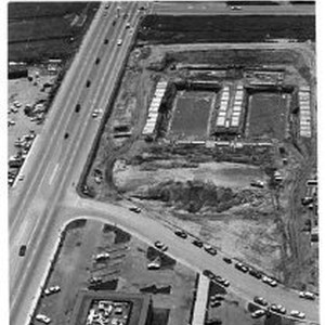 "This aerial view shows the progress of work on the $1.6 million Crossroads shopping center along Freeport Boulevard. The excavations are for basements of two of the six shopping pavilions which will be build around a garden court on the site. The white panels lining the excavations are wall panels, ready to be tilted up into place. The center's opening is scheduled for next fall. Last week, Blum's of San Francisco announced it would take over 3,000 square feet in one of the pavilions for a Sacramento Confectionary-restaurant. That's 35th Avenue in the distance"
