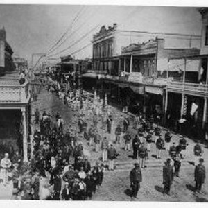Parade halts for photographer (apparently). Includes bands, uniforms, flags. Crowd watches.