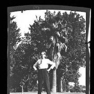 SERIES: Five views of men from Sacramento, taken by Isaac Lewis, about 1905. This view is of an unknown man standing by a palm tree with his hands on his hips.