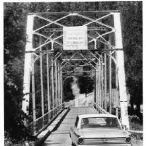 Caption reads: "The bridge across the South Fork of the Feather River at Enterprise provides the only all weather crossing of the stream on the road to Feather Falls. When the Oroville Dan is completed the site of the bridge will be under 600 feet of water."