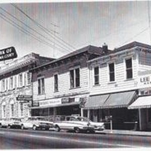 Photo--black and white: Looking north on Santa Rosa Avenue in Sebastopol circa 1960s. The Bank of Sonoma County on the corner of Main Street and Santa Rosa Avenue at left. Rayburns Delicatessen, beauty shop and Lee Peel barber.