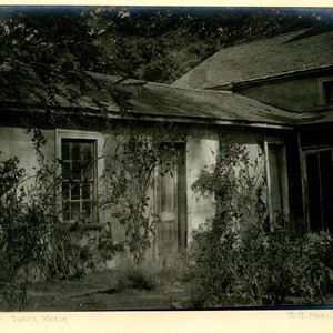 Adobe, Near Santa Maria: L-shaped house, overgrown plants [Dana Adobe, Nipomo, CA].