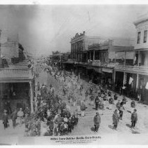 Copy Print: Elevated view of a parade sponsored by theTurn Verein Club of Sacramento. Caption is written in German