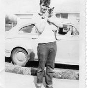 Photo--black and white: Unidentified teenage boy holding a cat in front of a 1947 or 1948 Chevrolet.