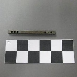 Spindle, doorknob. Metal rod meant to connect two knobs together, five holes.