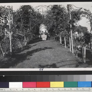 Mr. Huntington and Mr. Varnum sit on a bench under an arbor in the rose garden. The label that accompanies this photo in the album reads "No. 99 Rose garden - Mr. Henry E. Huntington and Mr. Varnum, about 1916."