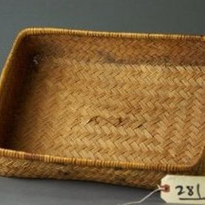 A two-piece, rectangular split cane woven basket. It has a top and bottom and originally had leather handles.