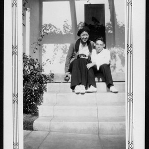 Y. C. and Mabel Hong are both sitting on the front steps of their home at 1045 S. Gramercy Place. Hong family papers. The Huntington Library, San Marino, CA.