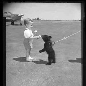 Zoo - Little boy feeding ice cream cone to bear cub on leash at airport.