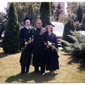 Fotografija Mihaela Kuzmiča, bivšeg dekana Evanđeoskog teološkog fakulteta u Osijeku, s dvoje studenata nakon promocije. [Description (original non-English/roman language/script)] Photograph of Mihael Kuzmič, former dean of Evangelical Theological Seminary in Osijek with two of his students after the graduation ceremony. [Description English/roman)]