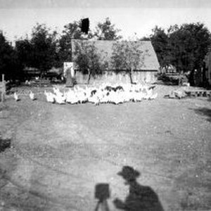 Print, 4" x 5". Farm with a flock of chickens, woman at a barn doorway