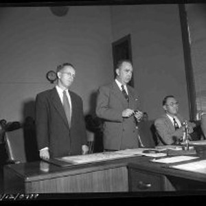 7/18/52 - Swindle trial in Placer court. 2 men standing and 2 seated in court room. 2of 2