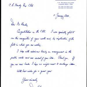 Correspondence from Denis Osborne to Charles Handy congratulating Handy on the CBE. Osborne states that he is especially glad to see this recognition of Handy's worth and the field in which Handy works. He proceeds to indicate that he uses Handy's ideas in training in the public sector, and hopes that if Handy is ever in London, they can meet and exchange ideas. He closes the letter with best wishes to Handy for a great year.