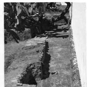 Photographs from Sonoma Mission Report. View of trench alongside a building at archaeological dig.