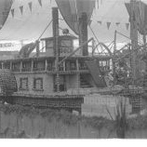 Postcard photo, black and white: A 1911 Gravenstein Apple Show exhibit of a replica of the steamship Gold that transported apples, fruit and goods from Sonoma County via Petaluma to San Francisco. The exhibit won first prize in 1911. Handwritten message on verso reads: "This is a boat in a pond of water and the wheel kept going around as if it was traveling it was just like one that used to ply between Tiburon and San Francisco and they had live ducks on the pond."