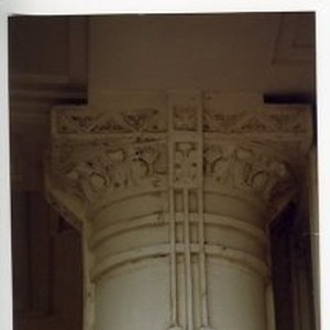 Exterior view of the Merrium Apartments before demolition. This view shows a close-up of the column.